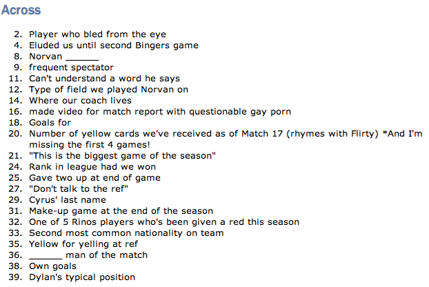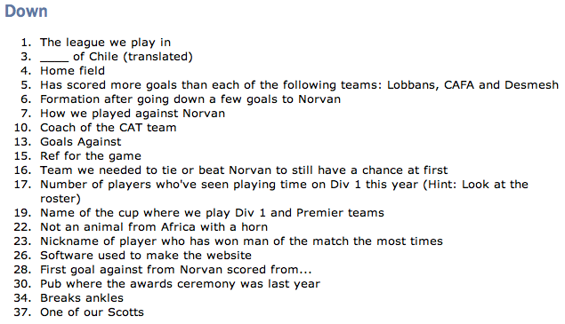 A large number of the clues are related to the Norvan game but there are a fair amount having to do with general club knowledge as well. If it’s not specified, the clue has to do with the Norvan game.